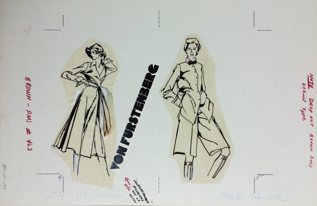 Fashion illustrations in advertising were either line drawings or wash drawings, which are pen and ink with added gray to black watercolor tones. Gouache, similar to watercolor but more opaque, was also used to show details. Line drawings give the essence of a look, but use of watercolors or gouache renders details more effectively, producing a more dynamic image. Fashion illustrations are better suited than fashion photography in newsprint as it is better suited showing details on that quality of paper.