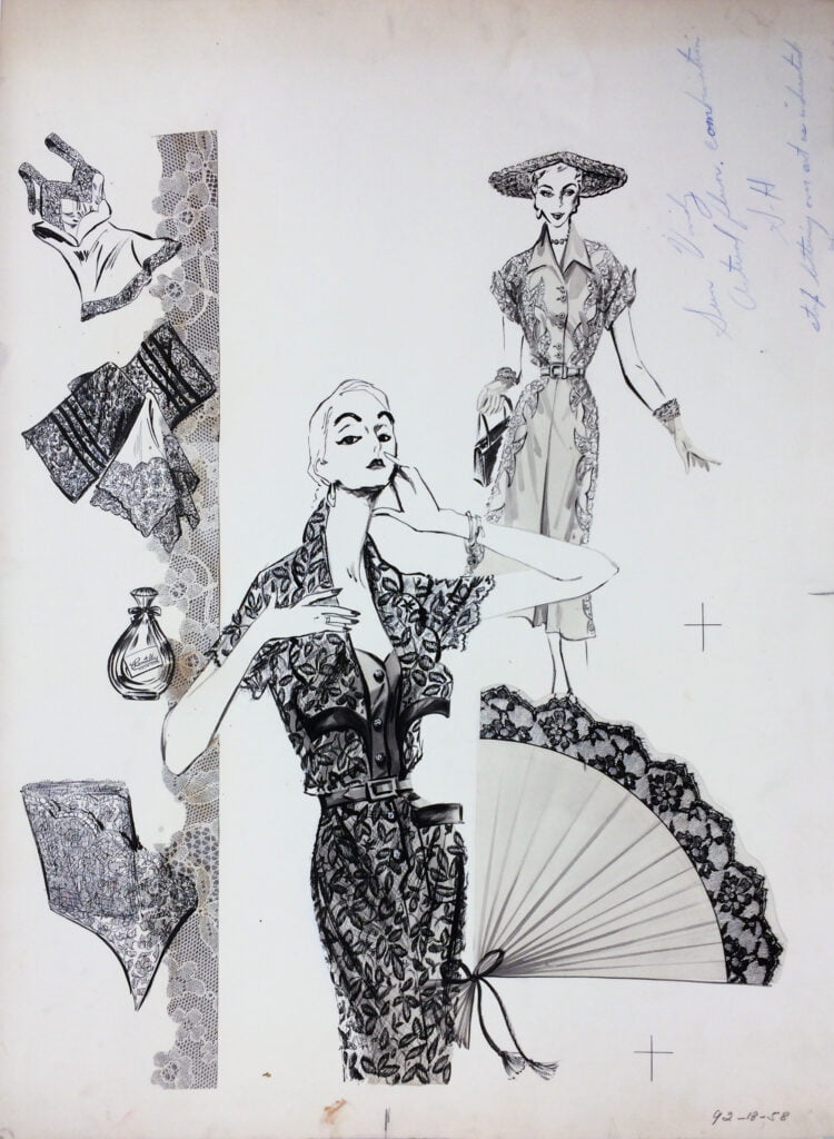 Norma Wagner Uray: Fashion Illustrations looks at Ms. Uray’s illustrations with four themes in mind: showcasing some original illustrations, the design process, representing clothing and attracting customers through advertising/layout, and the relationships with major department stores. She showed great variety in her designs, being able to effectively capture the look signature look of an era. She had a sophisticated design sensibility that was especially well-suited to rendering textures such as fur, tweed, herringbone or lace.