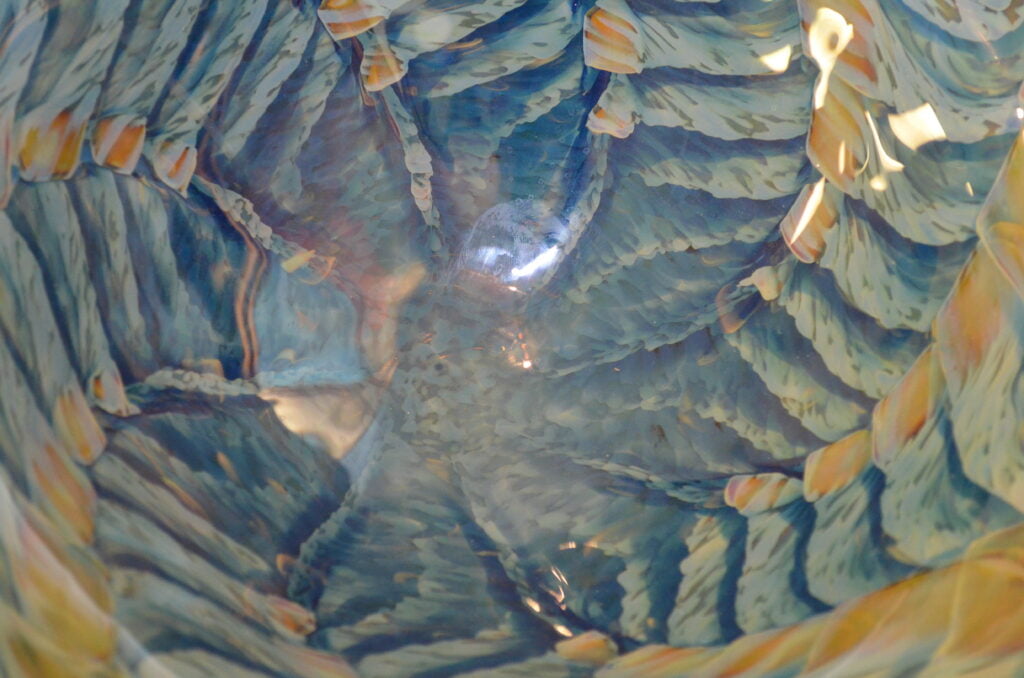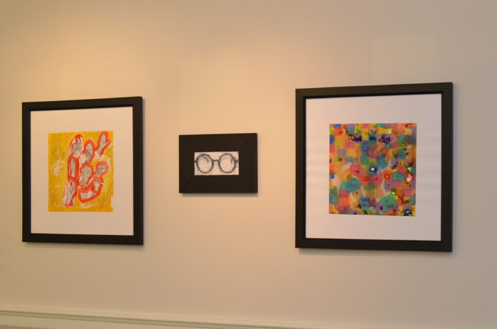 The image in Glasses was created out of 350 layers of identically digitally printed layers of fabric. Stacking them and viewing them from the side through the frayed edges is both deconstructing the image and making it visible. The large black frame serves as a way of containing the hundreds of layers of frayed fabric and as an anchor through which the art is on view in the same way that the glasses frame our view when worn.