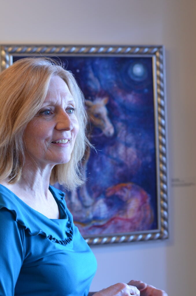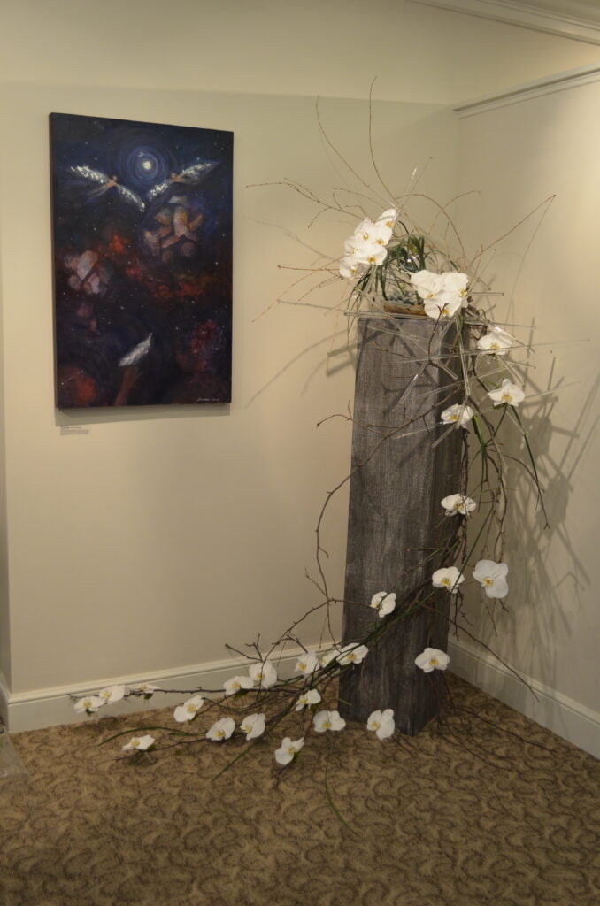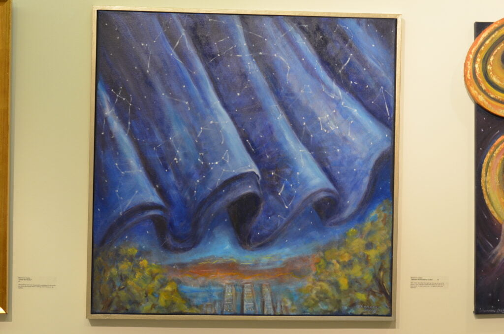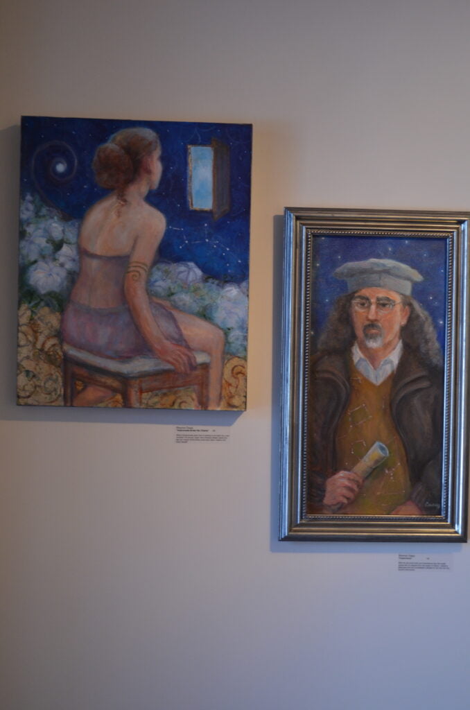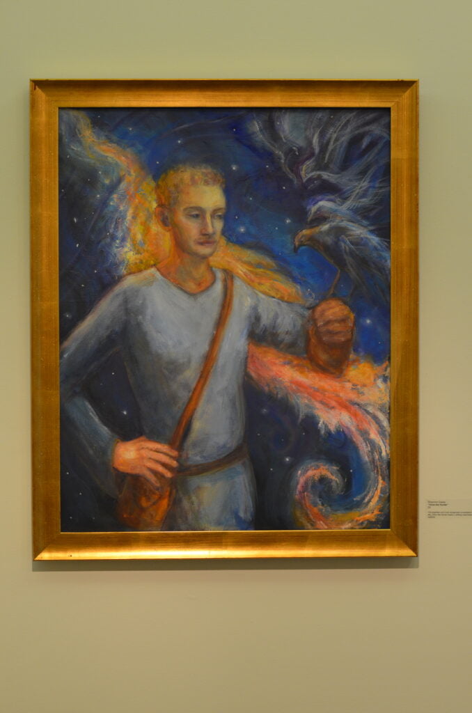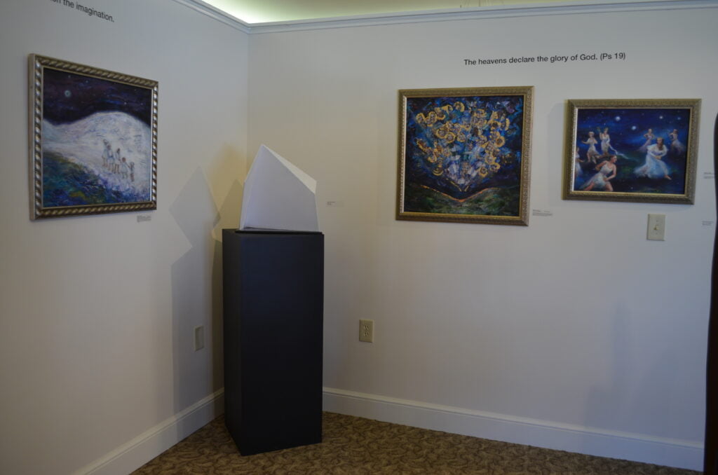“I enjoy creating figurative paintings that tell a story and much of my inspiration comes from the stars, probably fueled by the novels of Ray Bradbury early in life. In my artwork, I want to point people to the mystery of the heavens and ultimately to their creator. I work primarily in oils and enhance my paintings with collage and silver and gold leaf. My current series reflects some of the individual stories of the night sky as drawn from mythology, my imagination, and the Bible, particularly Psalm 19, “The heavens declare the glory of God.”