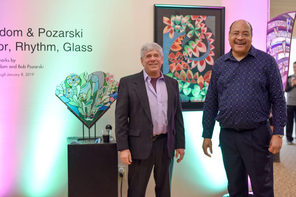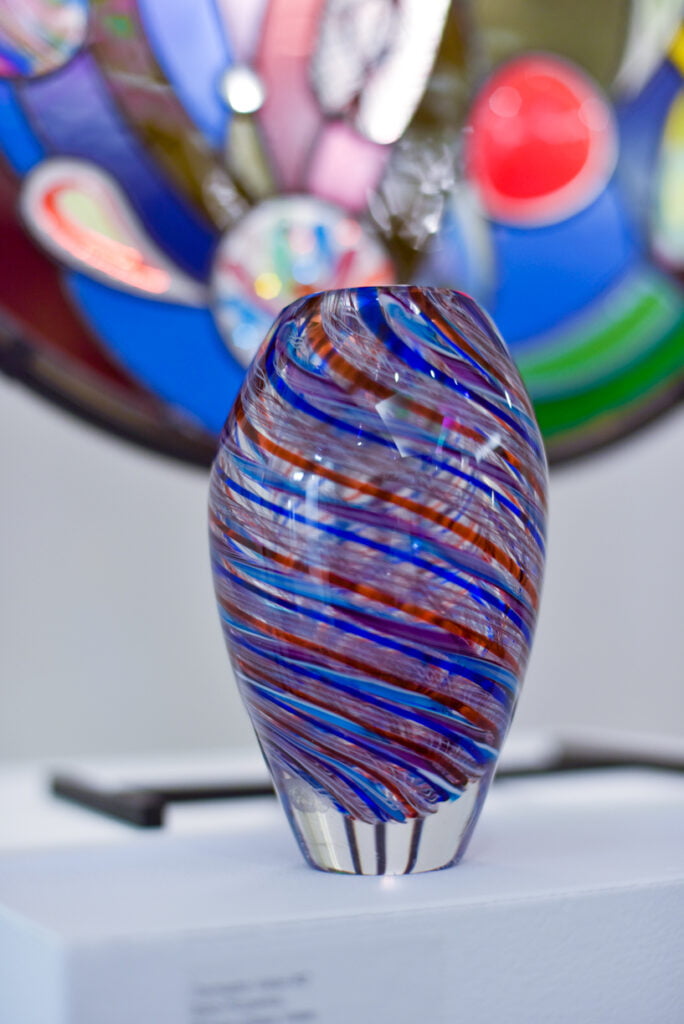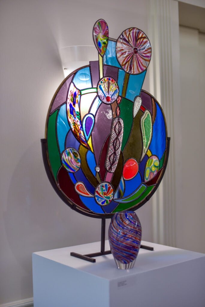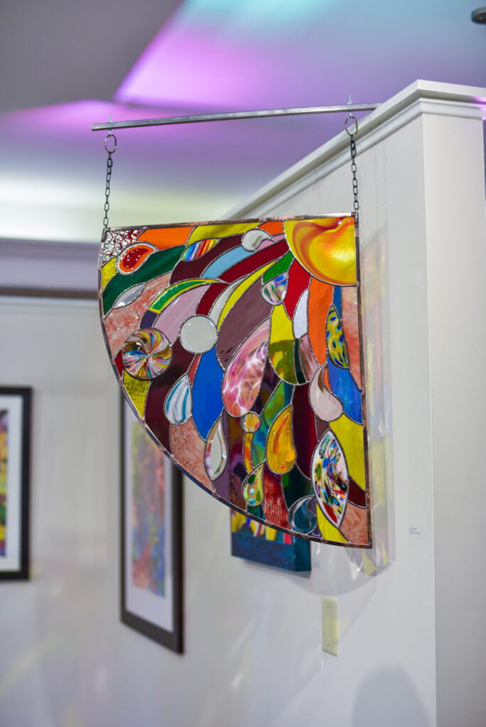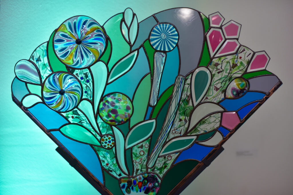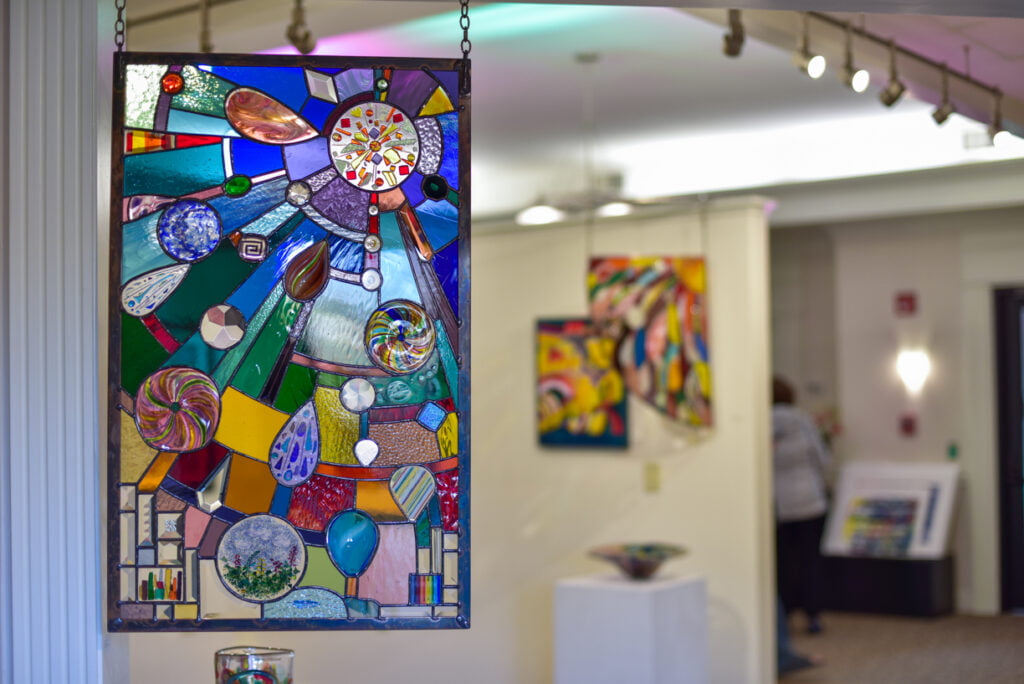 Bob Pozarski is a glass artist inspired by sunlight which has all colors of the rainbow and fills him with wonder and happiness . He keeps looking up, seeking out sunrises, eclipses, rainbows, and galaxies. Pozarski broke glass, played with fire, and made colorful items since the age of four. He is a glass-blowing instructor at the Peninsula Art Academy and is thrilled to have a career making thick, colorful glass by kiln, casting and blowing glass, and grinding it into prism shapes for his stained glass windows. His compositions are simple frameworks that hold a nice piece of glass up to the light. Pozarski has won numerous awards over the last 40+ years for his one-of-a-kind stained glass pieces incorporating kiln formed and blown glass.